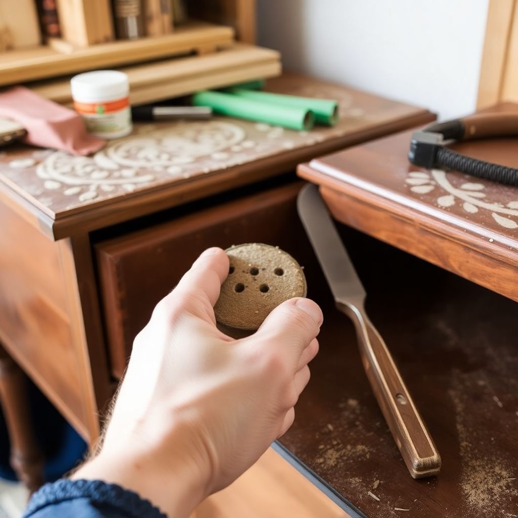 Если изделие скрипит, шатается или имеет трещины, самое время заняться ремонтом. Используйте клей для дерева и струбцины для фиксации. Сколы и выбоины можно заделать шпатлёвкой, подобранной по цвету. При необходимости замените шканты, шипы или шурупы. При реставрации антикварных предметов важно сохранить оригинальные элементы, поэтому старайтесь использовать восстановление, а не замену.